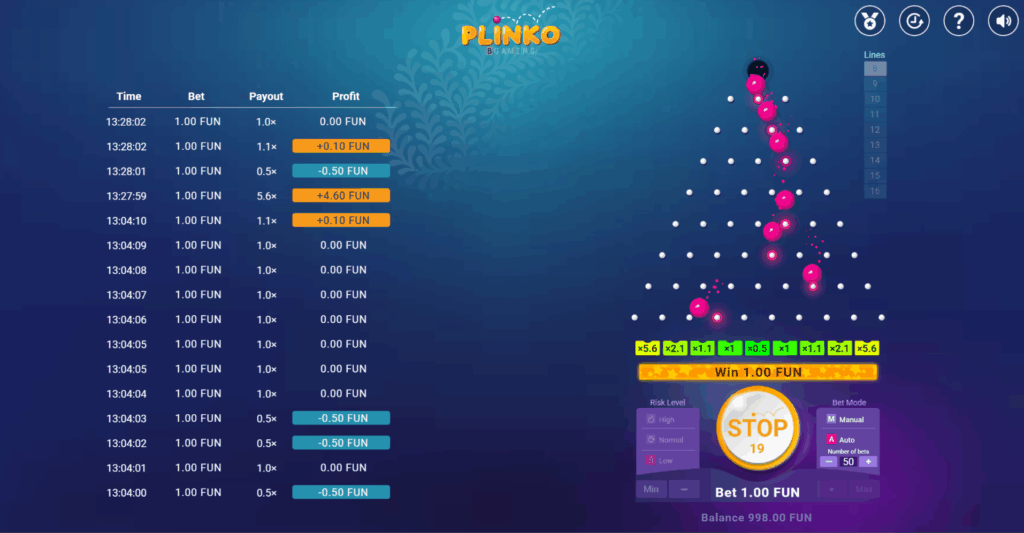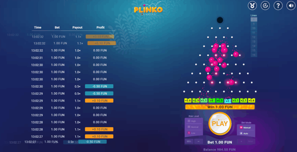 The setup’s nothing groundbreaking — five reels, three rows, twenty-five fixed paylines. What caught my eye were the symbols, though: little balls that drop like in Plinko itself, different coloured chips worth varying amounts, and even the occasional bonus symbol shaped like a Plinko prize board square. They did well making everything feel connected without beating us over the head with the theme, y’know?